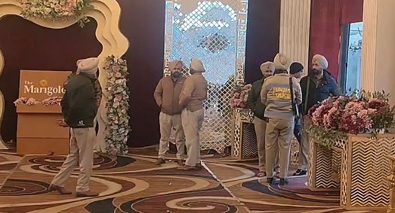 Police officials at the Amritsar resort where AAP sarpanch Jarmal Singh was shot in the head. An Aam Aadmi Party