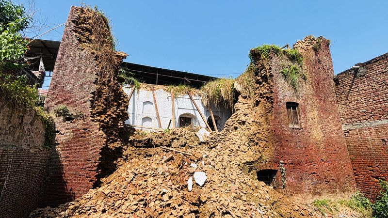 Five-centuries-old Lahori Darwaza at Sri Hargobindpur here faces an imminent danger of collapse after floodwaters damaged its huge supporting wall.